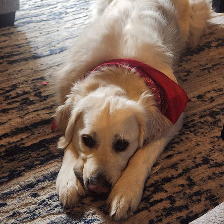 This is Bailey, his favorite things include leaves, peanut butter, and biting my toes. He loves stealing my socks and hiding them around the house. He is a big fan of the Colorado cold and loves a good snowstorm to snuggle up and watch It's a Wonderful Life with his handler, since he is named after George Bailey. Bailey is working so hard and is already halfway through training and started his task work. This team is a dream to watch! This last year was a busy one as he was part of an engineering design project for elderly and disabled dogs and he was the ring bearer for his handlers wedding and he signed the marriage license as their witness!