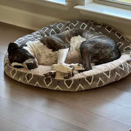 She is a very sweet, laid back soul with lots of pitty personality! She loves squeaky toys, chew treats, and most of all relaxing in one of her many beds. She absolutely loves to snuggle and be loved on and we are using that to our advantage in our training! She’s a fast learner and loves being able to help her mom!